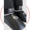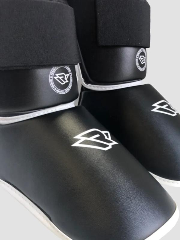 Фиксация на ноге осуществляется с помощью двух широких липучек, расположенных эргономично — это гарантирует плотное прилегание, исключает смещение и проворачивание защитных щитков во время движения. Резинки для стопы и пятки дополнительно фиксируют изделие, обеспечивая устойчивость при резких манёврах, прыжках и блокировании ударов.